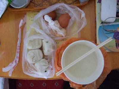 今日の朝食は、昨日と殆ど同じだったのですが更に飽きが来るような内容になっており、お粥の代わりに豆漿(とうしょう)、包子(肉まん)×4個、ゆで卵×2個、カブの漬物。さすがに肉まん4つは飽きるねぇ(ーー;)