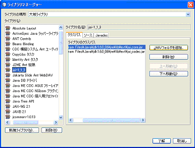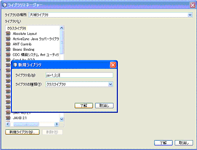 新規ライブラリボタンをクリックして、「ライブラリ名」を自分で分かりやすい名前を設定して(例:jai-1_3_3 )、「ライブラリの種類」はデフォルトのままの"クラスライブラリ"を選択して、了解ボタンを押します