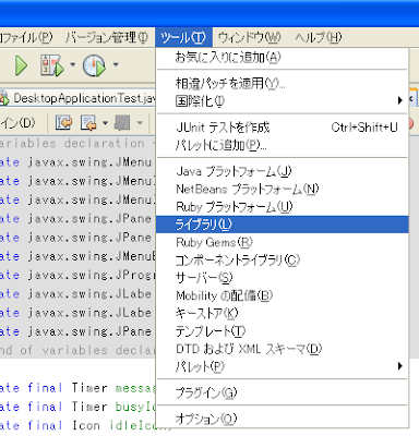 NetBeansを立ち上げて、メニューからツール(T)>ライブラリ(L)を選択します。