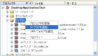 開発中のプロジェクトウィンドウ内に「ライブラリ」というノードがあるので、そこを右クリックします。ポップアップ画面からライブラリの追加を選択し、JAIライブラリを追加します。