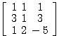 #include <stdio.h> #define N 3 double A[N*N]; double x[N*N]; int main(void) { static long int i; static long int n=N,inc=3,info,piv[N]; A[0]=1.;A[1]=3.;A[2]=1.; A[3]=1.;A[4]=1.;A[5]=-2.; A[6]=1.;A[7]=-3.;A[8]=-5.; x[0]=1.;x[1]=0.;x[2]=0.; x[3]=0.;x[4]=1.;x[5]=0.; x[6]=0.;x[7]=0.;x[8]=1.; printf("N = %d\n",N); dgesv_(&n,&inc,A,&n,piv,x,&n,&info); printf("%lf %lf %lf\n",x[0],x[3],x[6]); printf("%lf %lf %lf\n",x[1],x[4],x[7]); printf("%lf %lf %lf\n",x[2],x[5],x[8]); return 0; } |