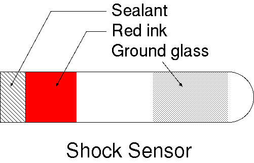 このタイプは極めて簡単な衝撃感知センサーである。細いガラスチューブの中に色の付いた粘性を持つ液体が封入されている。衝撃がガラスチューブに伝わると、液体が飛び散って、すりガラスの方に飛び散る。すりガラスが色が付いているかどうかを見れば、衝撃が加わったかどうかが分る。
